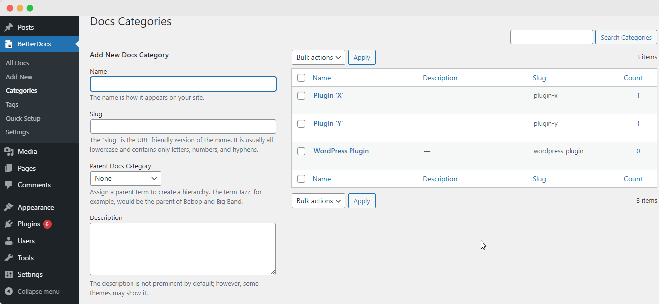 • To enable Sorting, first, open your WordPress Dashboard and navigate to BetterDocs>>Categories. Create as many categories as you need.
