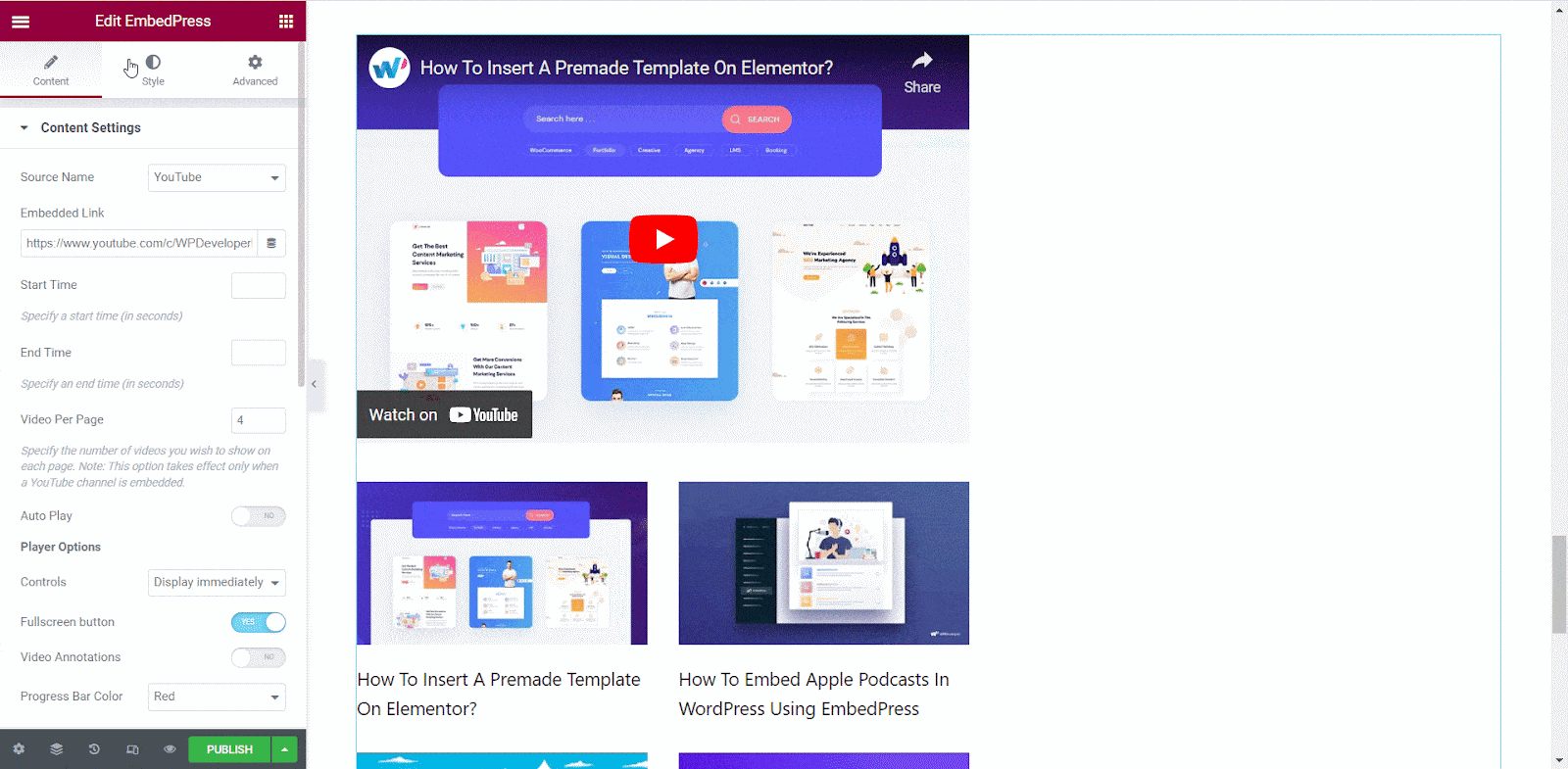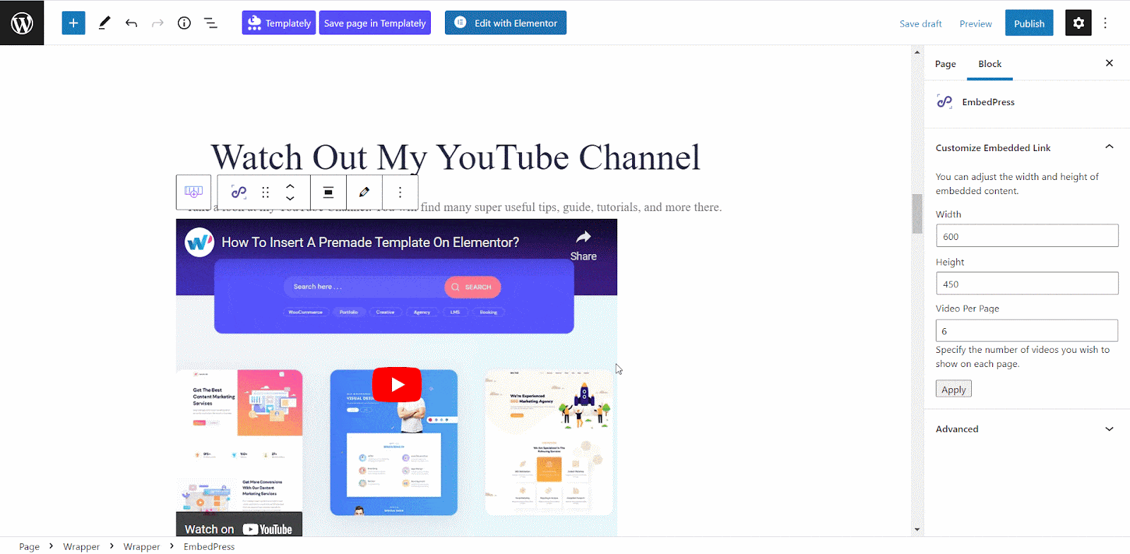 You can change the dimensions of the embedded YouTube channel and control how many videos you want to display on a single page easily from the EmbedPress dashboard.