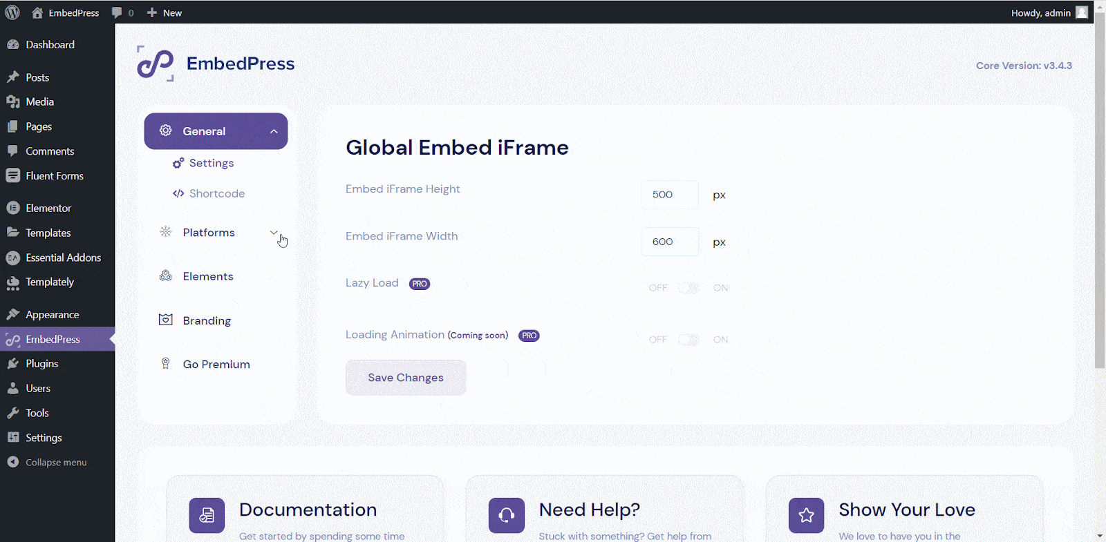 First, navigate to ‘EmbedPress’→ ‘General’→‘Settings’ from your WordPress dashboard. Now, you can personalize the height and width of your embedded content from there and then hit the ‘Save Changes’ botón.