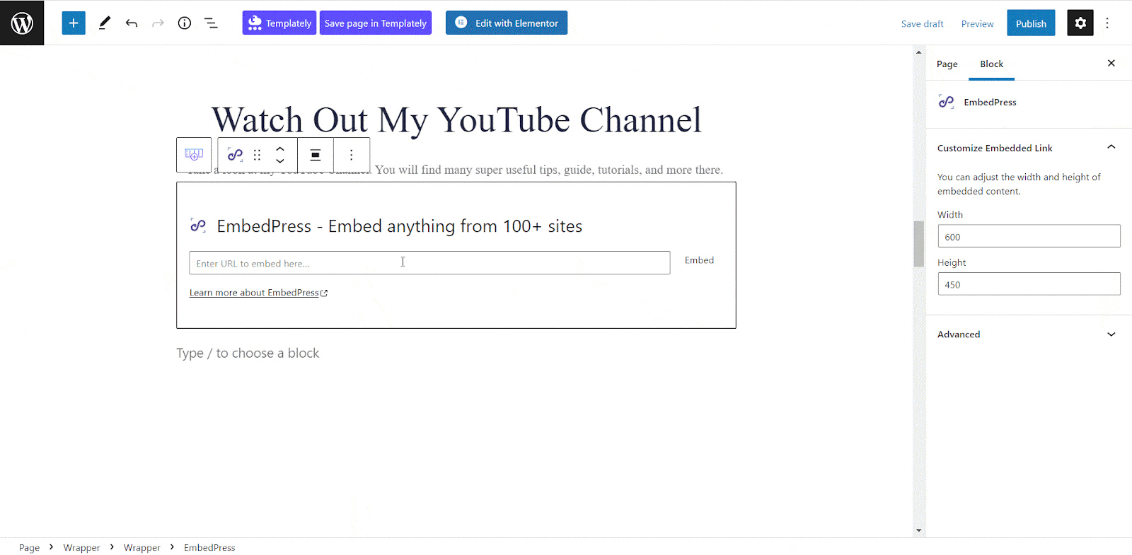 EmbedPress comes with its own block for embedding any type of content using the Gutenberg editor, Classic Editor, Elementor, or others using simple shortcodes. To embed a YouTube channel in Gutenberg, follow the steps below.
