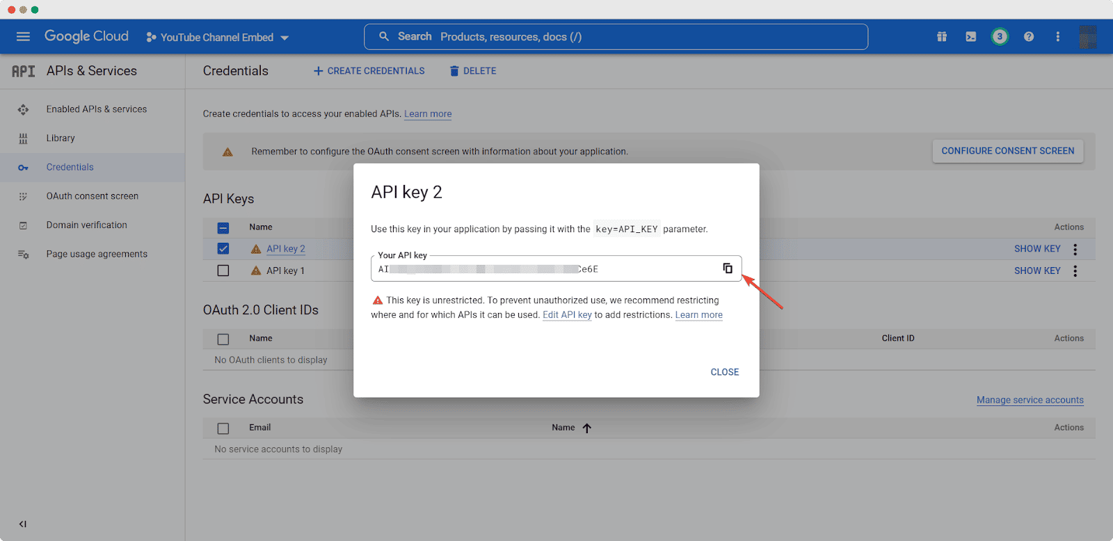 For that, you have to visit the Google Cloud Console and copy it from the credential tab. You can follow this link to learn how to manage YouTube API Key in detail.