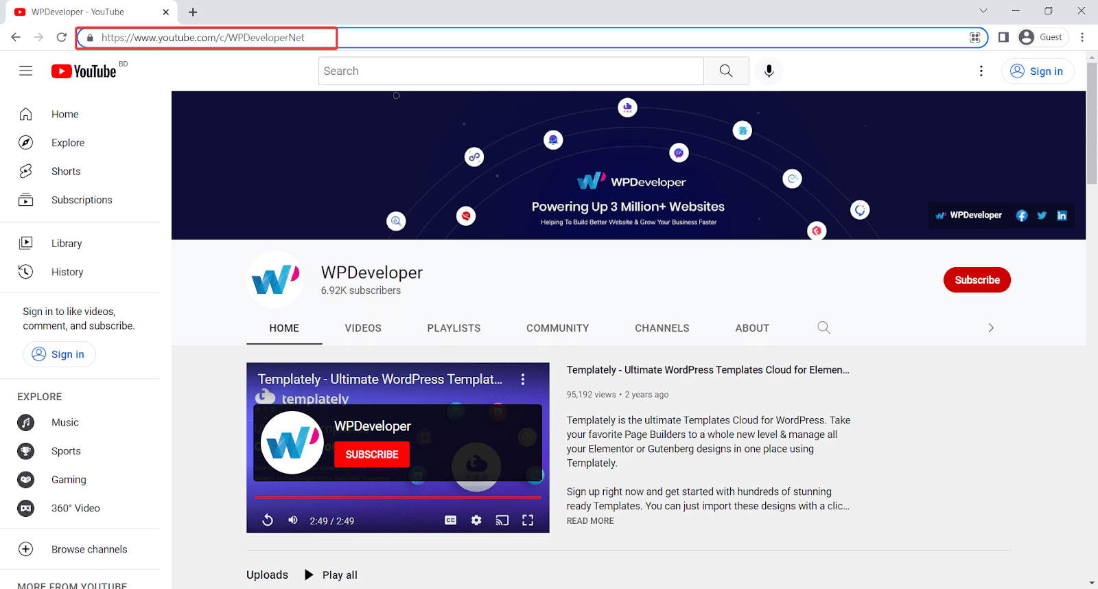 A collect YouTube channel URLs, you need to visit the channel you want to embed on your WordPress website first. Afterward, just copy your YouTube channel URL directly from your browser’s address bar.